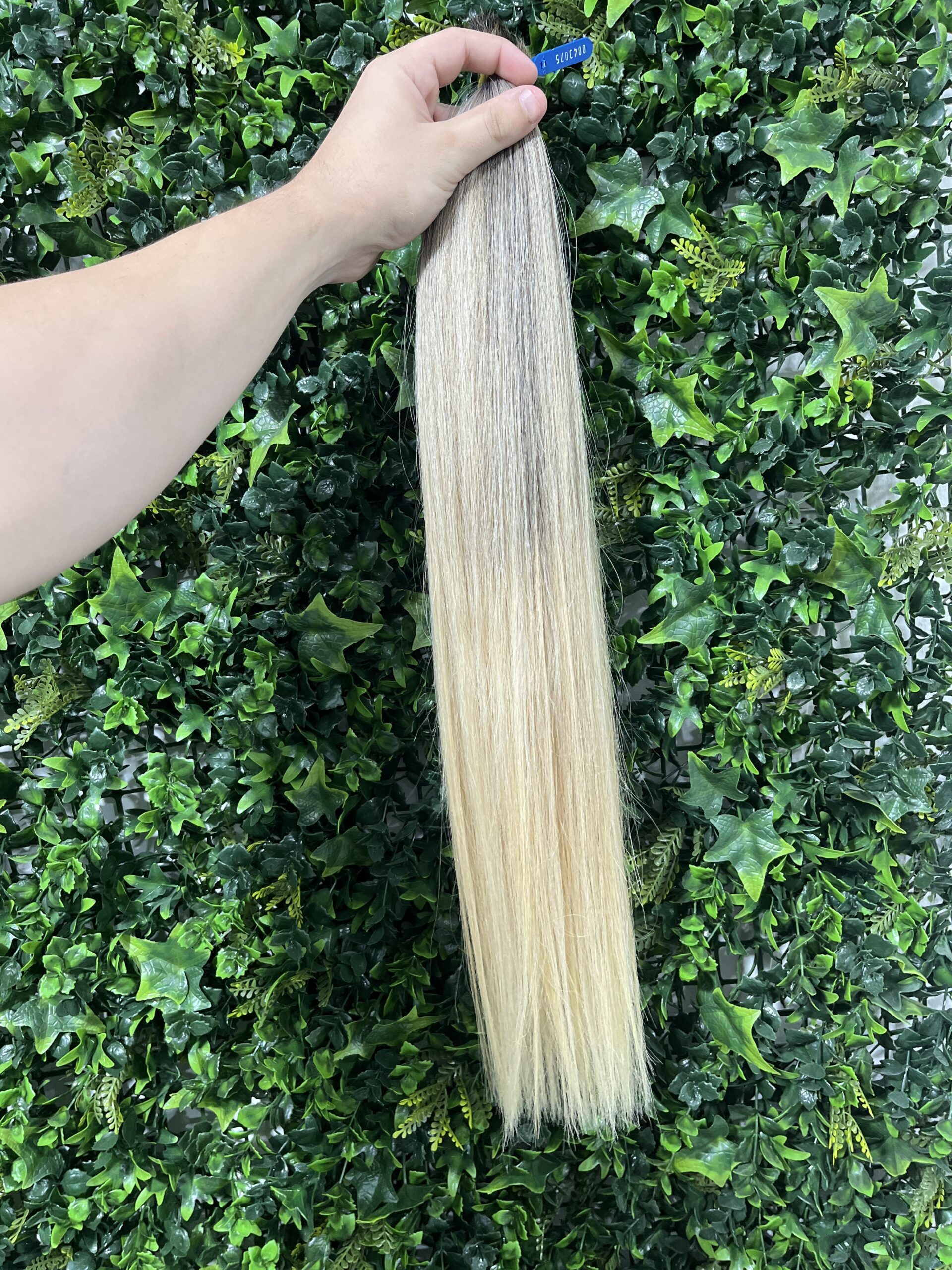 Cabelo brasileiro, na tonalidade Loiro descolorido, com Fio Médio de 63 centímetros e 125 gramas