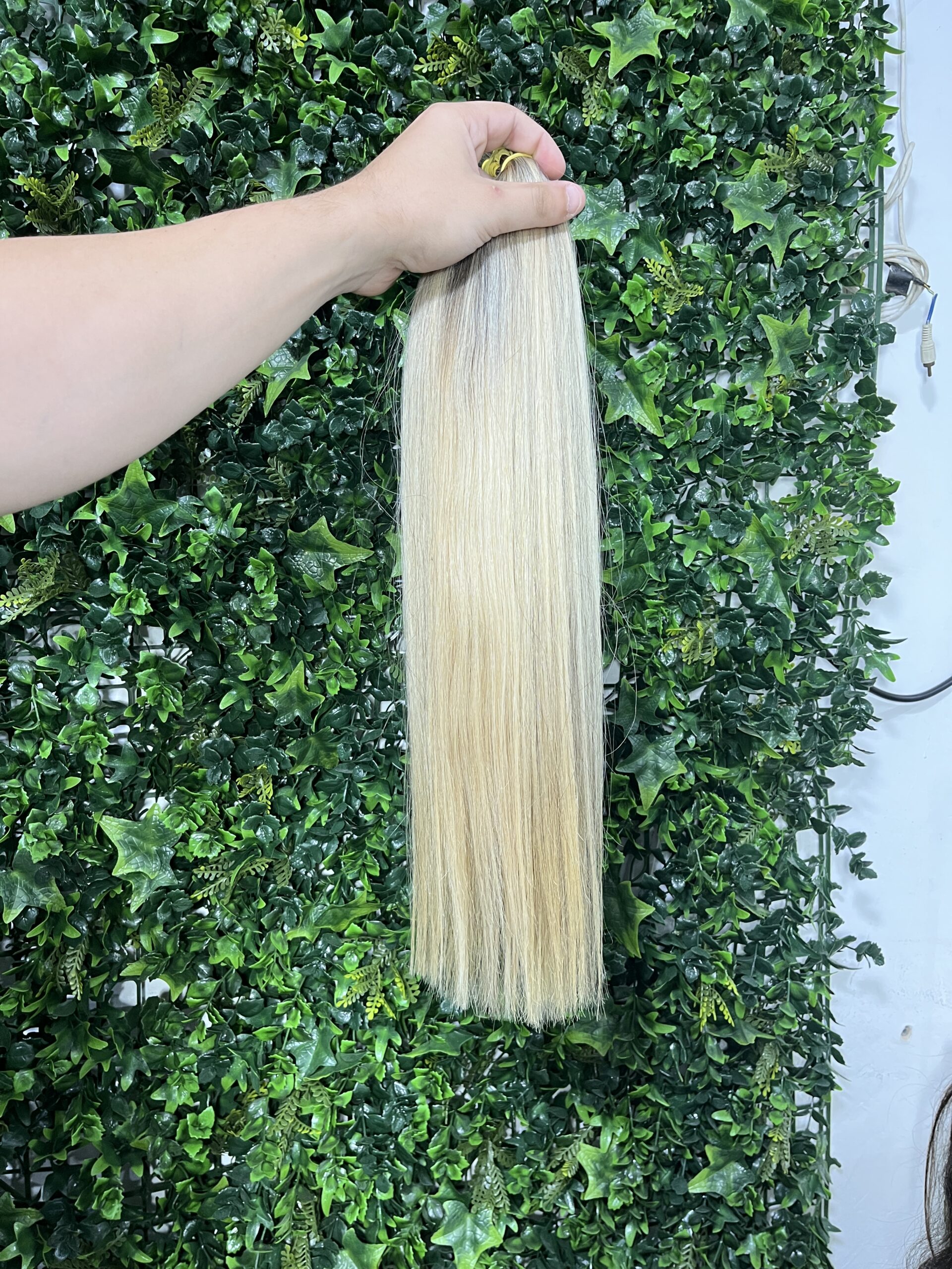 Cabelo brasileiro, na tonalidade Loiro mechado, com Fio Médio de 57 centímetros e 120 gramas